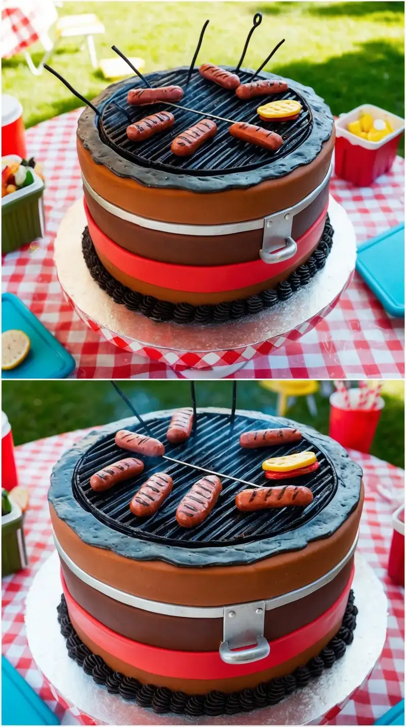 Imagine a cake that looks like a BBQ grill filled with sweets! The sight of it makes everyone’s mouth water. A friend chuckles, “This looks like dinner and dessert!” They can’t wait to try a piece, imagining sizzling sausages and perfectly grilled burgers. It perfectly blends fun and flavor, bringing everyone together around the table.