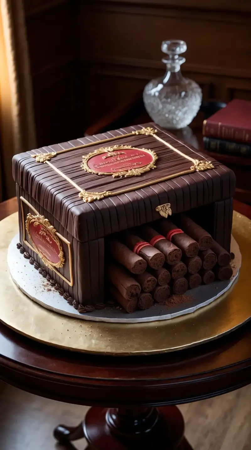 A cake crafted to mimic a cigar box catches everyone's eyes. The dark wood-like finish and small decorative details create intrigue. “This looks so classy!” a guest notes, while others nod in agreement. It sparks conversations about the finer things in life, as everyone savors each bite.