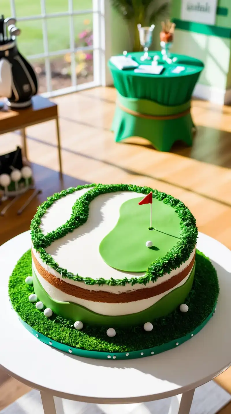 A cake resembling a lush green golf course? Yes, please! The tiers of the cake mimic rolling hills, with little chocolate golf balls scattered about. Laughter fills the air as someone points out the tiny flag on top. “Look, it’s like the last hole!” your buddy exclaims, smirking. Everyone gets lost in conversation about their favorite golf games while enjoying a piece of this clever creation.