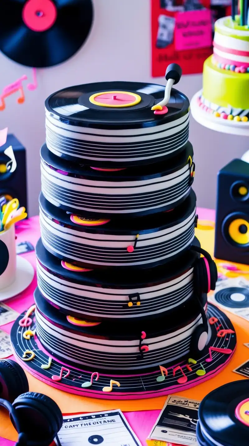 Imagine the joy of a cake inspired by music! A stack of fondant vinyl records takes center stage, echoing sweet melodies. “Let’s crank up the tunes!” a friend exclaims, tapping their foot to the imaginary beat. Each piece captures the spirit of a party, making it a celebration filled with good vibes.