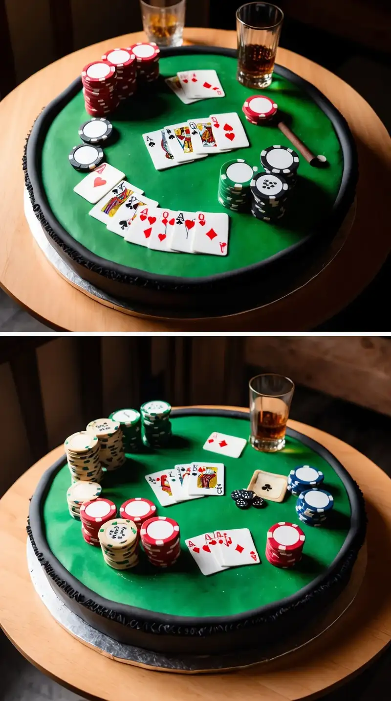 A cake resembling a poker table stands ready for games. Everyone chuckles, eager to jump into fun. “Who's ready for some friendly competition?” one player asks, fingers itching to get started. It opens up laughter and joy, making it more than just dessert but rather the start of a memorable night.