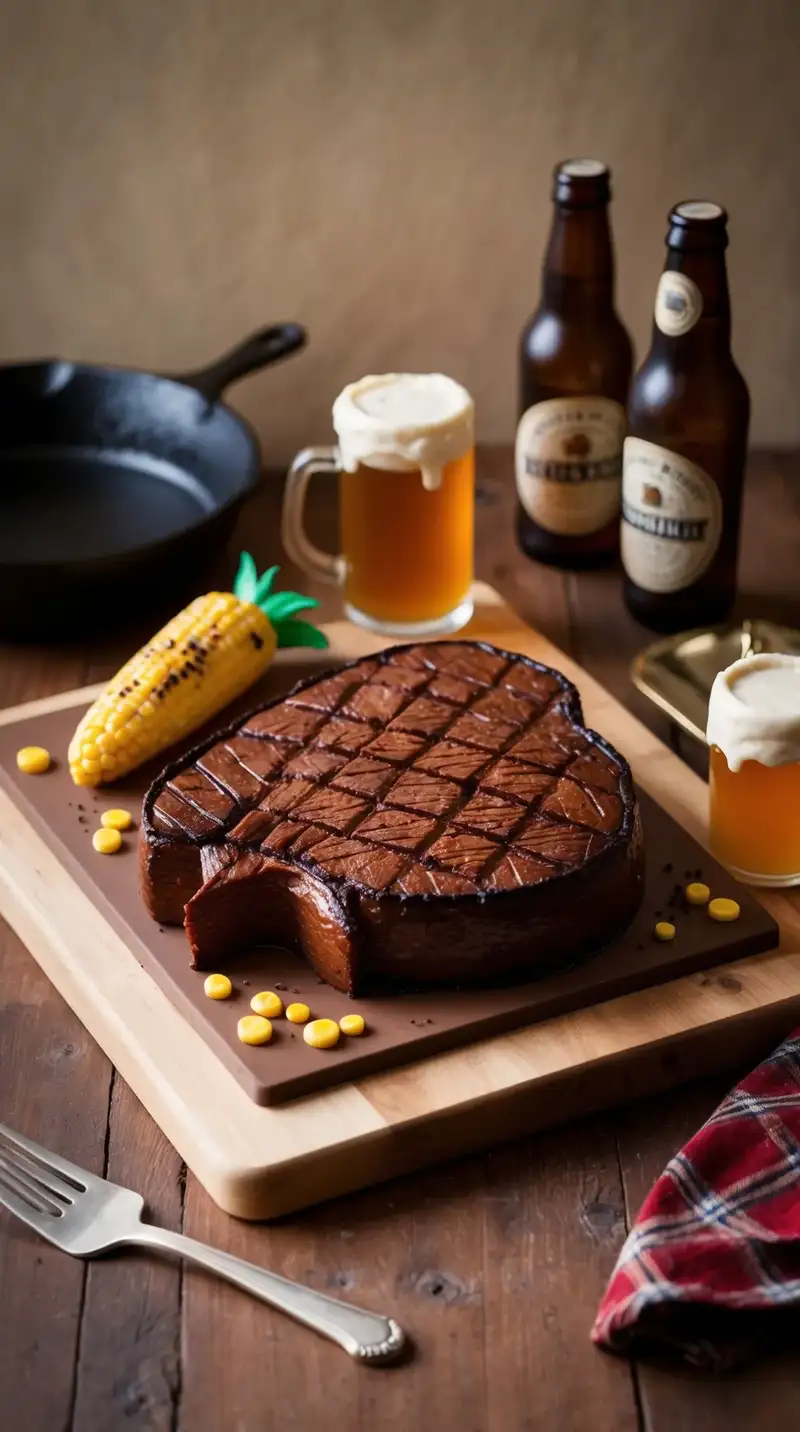 How about a cake that looks like a rustic steak? A smoky scent wafts through the air, making mouths water. Someone nudges their neighbor, pointing at the details that almost make it look real. “This is going to be a fun dinner!” they giggle. The cake highlights the birthday man’s love for great food and good times, with friends diving into conversations about the perfect BBQ.