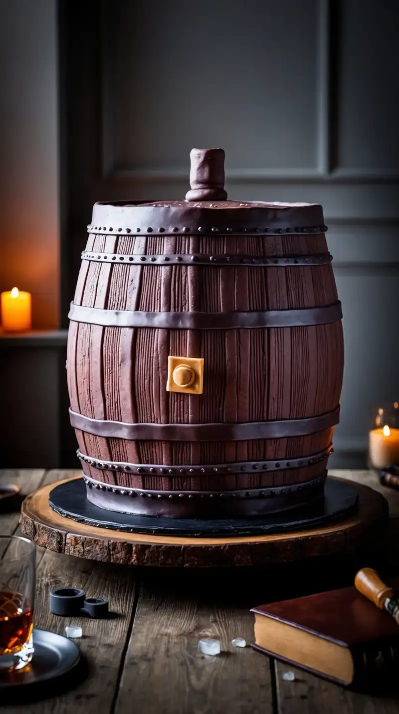 Visualize a cake that looks just like a whiskey barrel. Curved and detailed, it’s an eye-catching centerpiece. Friends gather around, chatting about their favorite drinks. “I can almost taste it!” someone laughs, raising a glass in the air. The cake echoes memories of quiet evenings shared over favorite bourbon.