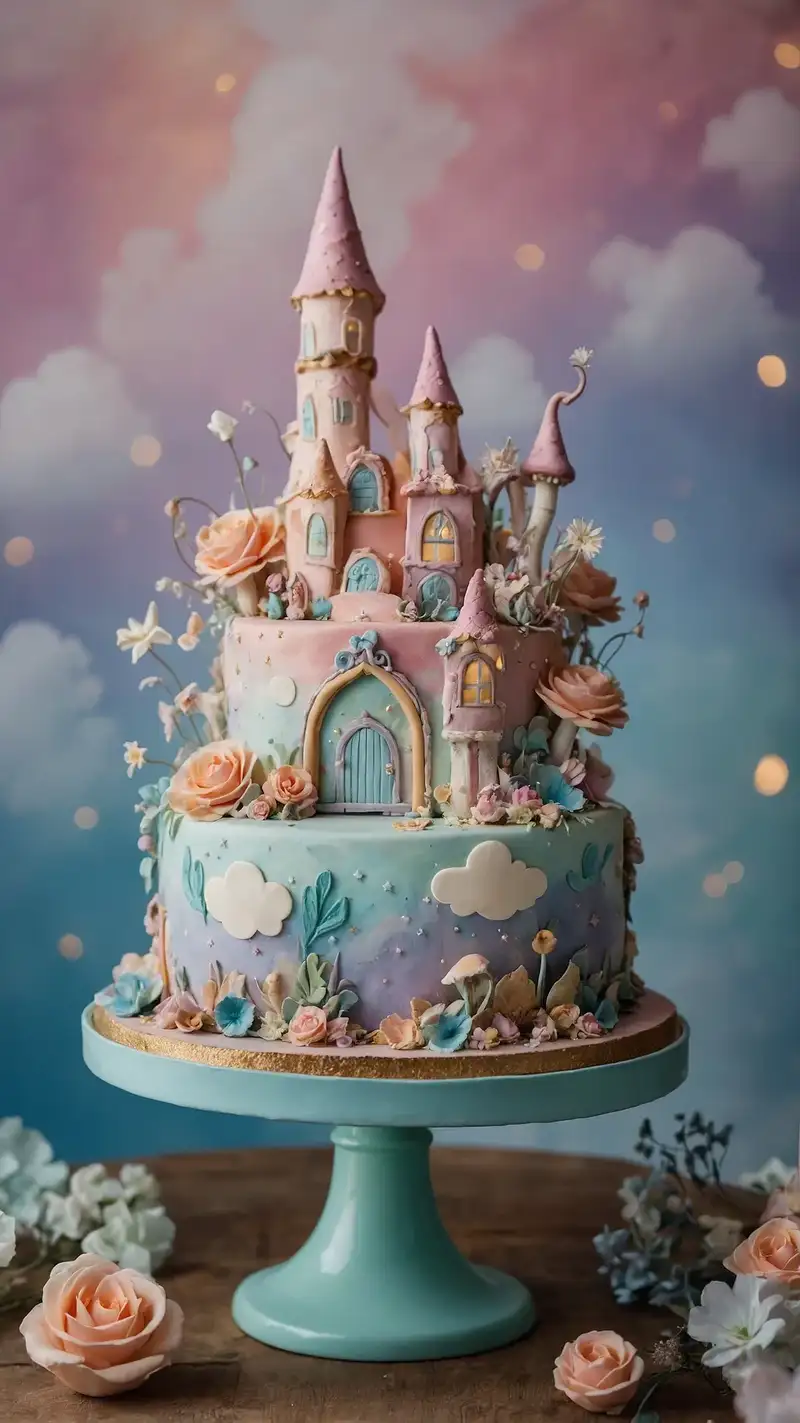 Picture a cake that feels magical. It looks like a fairy tale land, filled with clouds and stars. Each tier invites you to lift off into the sky.