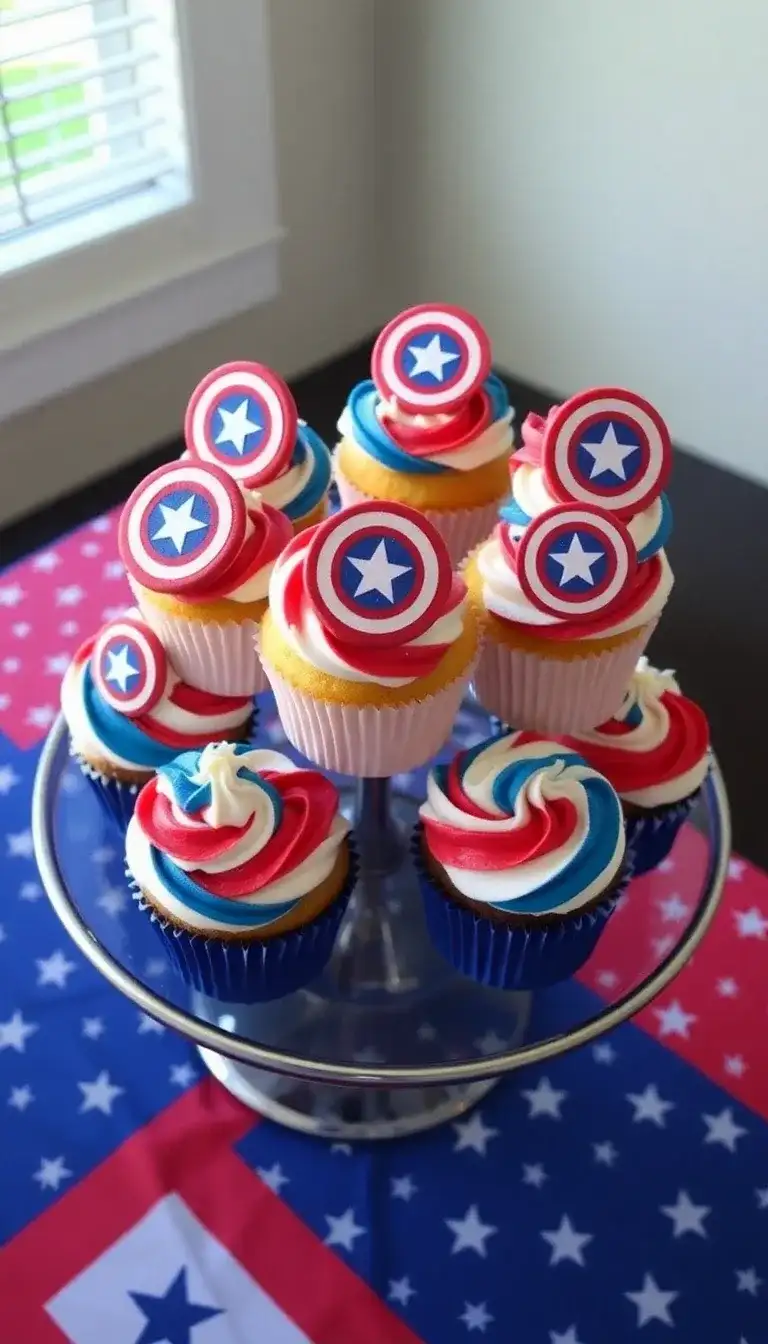 Look at these fun cupcakes! They are dressed in red, white, and blue, just like the colors of a flag. Each cupcake has swirls of frosting that are bright and cheerful. On top, there are cool decorations that look like a superhero's shield! These treats would be perfect for a party or a special celebration. They make everything feel festive and exciting. Who wouldn’t want to eat one of these yummy cupcakes?