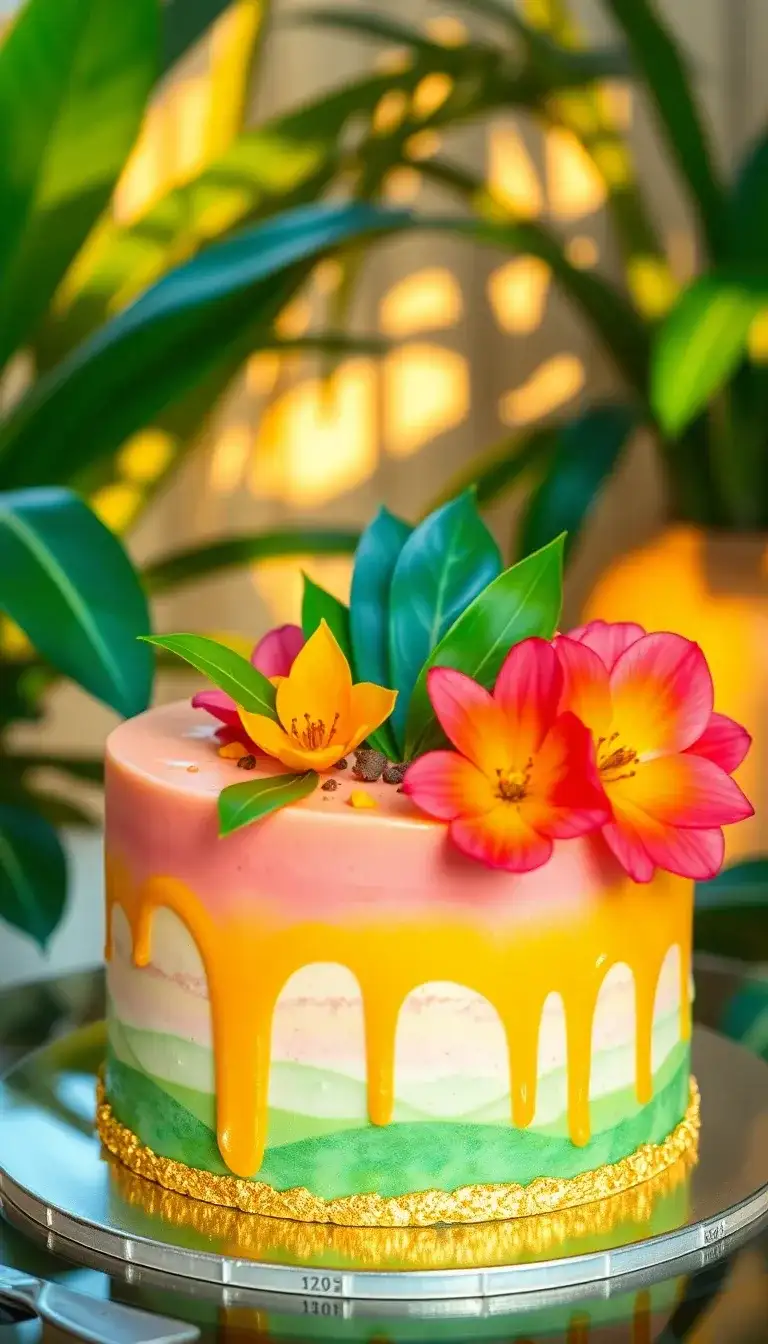 The Passionfruit Tropical Cake is a bright and cheerful dessert that looks like a sunny day at the beach. It has beautiful layers in colors like pink, green, and yellow. The top is decorated with pretty flowers and shiny drips, making it look extra special. Imagine sharing this cake at a party with friends. Everyone would smile and enjoy a slice of this tasty treat. It’s perfect for celebrations and brings a taste of the tropics to any gathering!