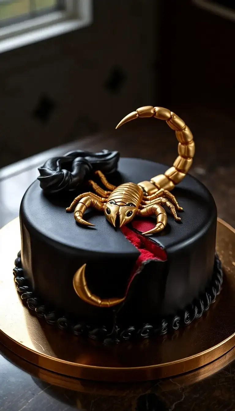 The Scorpion Cake is a super cool dessert that looks like a giant black scorpion! It has shiny golden parts that make it look special and fun. The cake is covered in dark icing, which makes the bright scorpion pop out. There’s even a red part that looks like it’s been cut, adding a little spooky touch. This cake is perfect for birthday parties or Halloween! Everyone will be amazed when they see it. It’s not just a treat, but also a piece of art!
