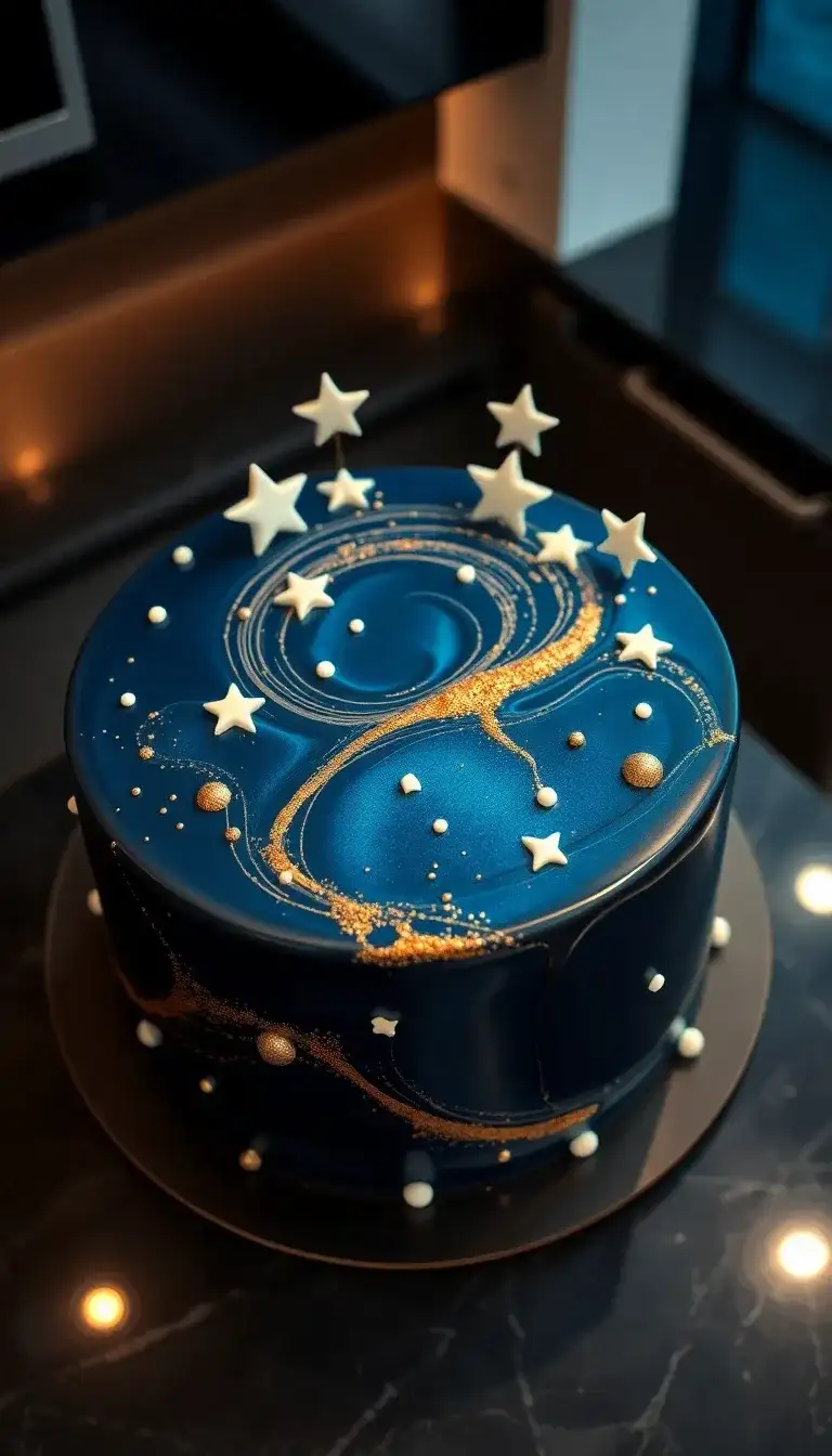 The "God's Plan Galaxy Cake" is a cool treat that looks like a piece of the universe! It has a rich blue color, shining like a starry night. Little white stars and shiny gold sparkles swirl around the cake, making it look magical. The design shows swirls that remind us of galaxies far away. This cake would be perfect for a party or a special celebration. Everyone would love to share a slice of this cosmic delight!