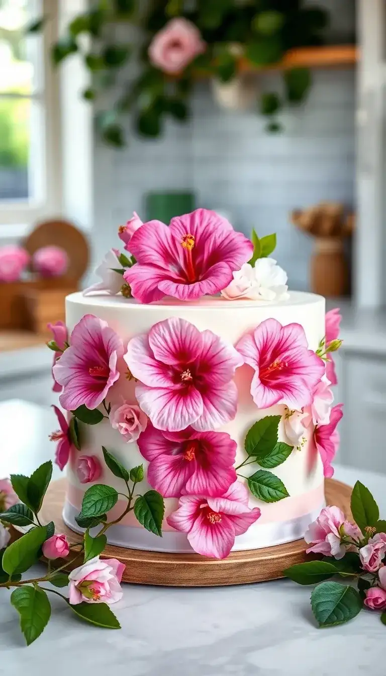 The "More Life Flower Cake" is a beautiful treat that looks like a garden in bloom! It is covered in bright pink flowers that seem to dance across the cake. Each flower has its own unique shape, making the cake look special and fun. Green leaves peek out from behind the petals, adding a fresh touch. This cake would be perfect for a party or a celebration. Everyone would love to see such a colorful and happy cake! It brings joy and reminds us of sunny days filled with flowers.