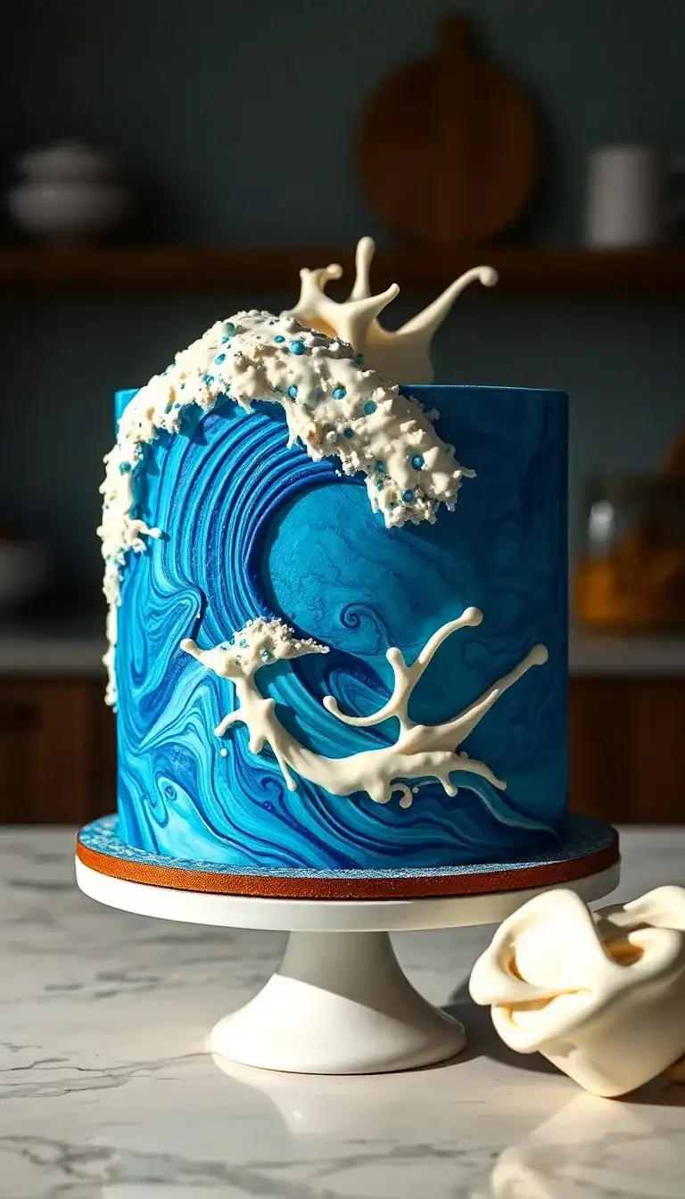 This cake is super cool and looks like a big wave! It has bright blue colors that swirl together, making it look like the ocean. White icing splashes over the top, just like water splashing when a wave crashes. There are tiny blue decorations that look like bubbles in the sea. This cake would be perfect for a party or a special day. Everyone would want a slice of this awesome wave cake!