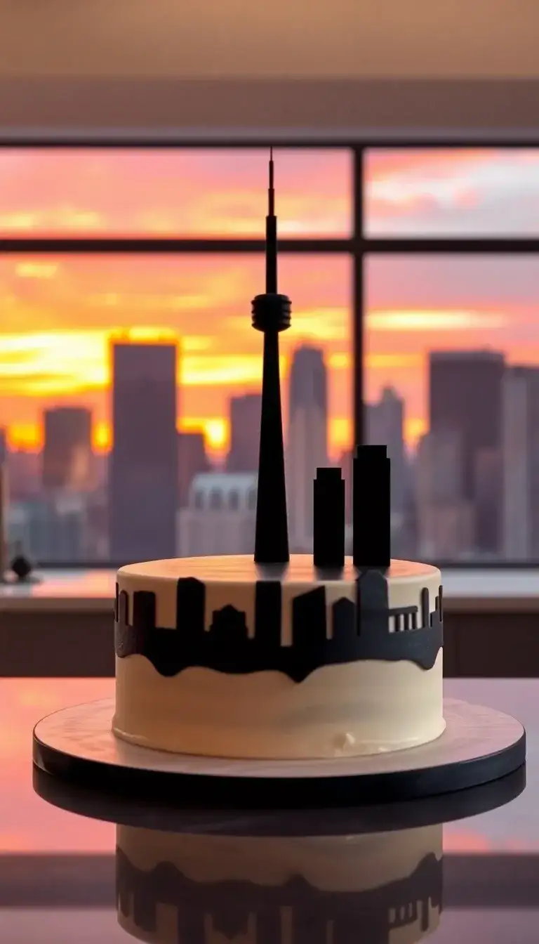 The Skyline Cake is super cool and special! It has a shiny, smooth surface that looks just like a city skyline. Tall buildings pop up from the top, making it look like a real city from high above. The black shapes stand out against the creamy white cake. Behind it, a beautiful sunset paints the sky with bright colors. This cake would be perfect for a celebration, bringing smiles to everyone who sees it! It really makes you think of adventures in the city.
