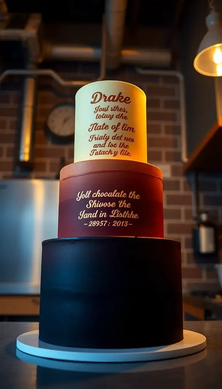 Drake is a famous rapper, and he has a fun cake named "Started From The Bottom Tier Cake." This cake has three big layers, each a different color. The top layer is light yellow, the middle layer is a deep red, and the bottom layer is black. Each layer has special words written on it. These words tell a story about starting small and working hard to become big. The cake looks really cool and is perfect for a party. Everyone would love to celebrate with a cake that shows how far someone can go!
