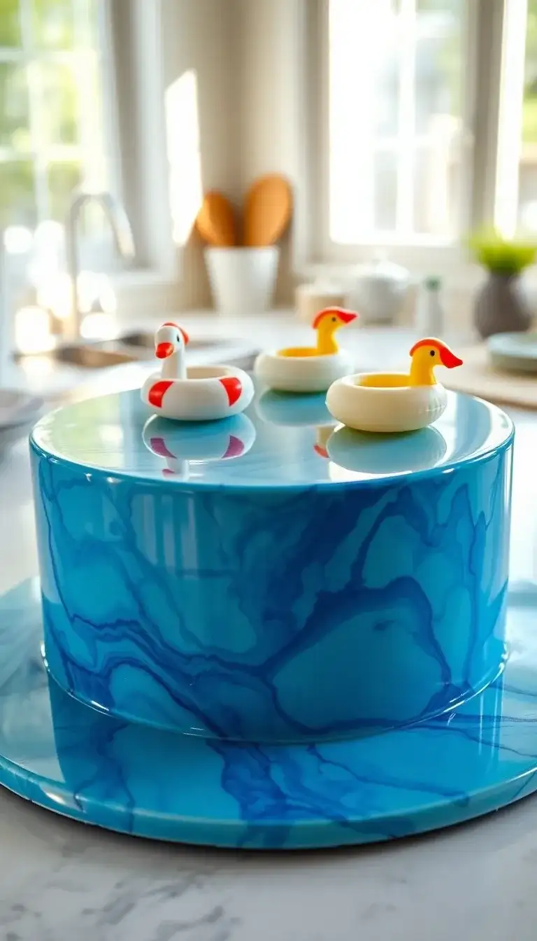 The "Summer Sixteen Pool Cake" is a fun and colorful treat that looks just like a sparkling swimming pool! It has a beautiful blue design that reminds us of sunny days and splashing water. On top, there are cute little rubber ducks enjoying a swim. These playful ducks bring a smile and make the cake perfect for summer parties. Everyone loves to dive into a cake that looks so refreshing and bright! It’s a great way to celebrate warm weather with friends and family.