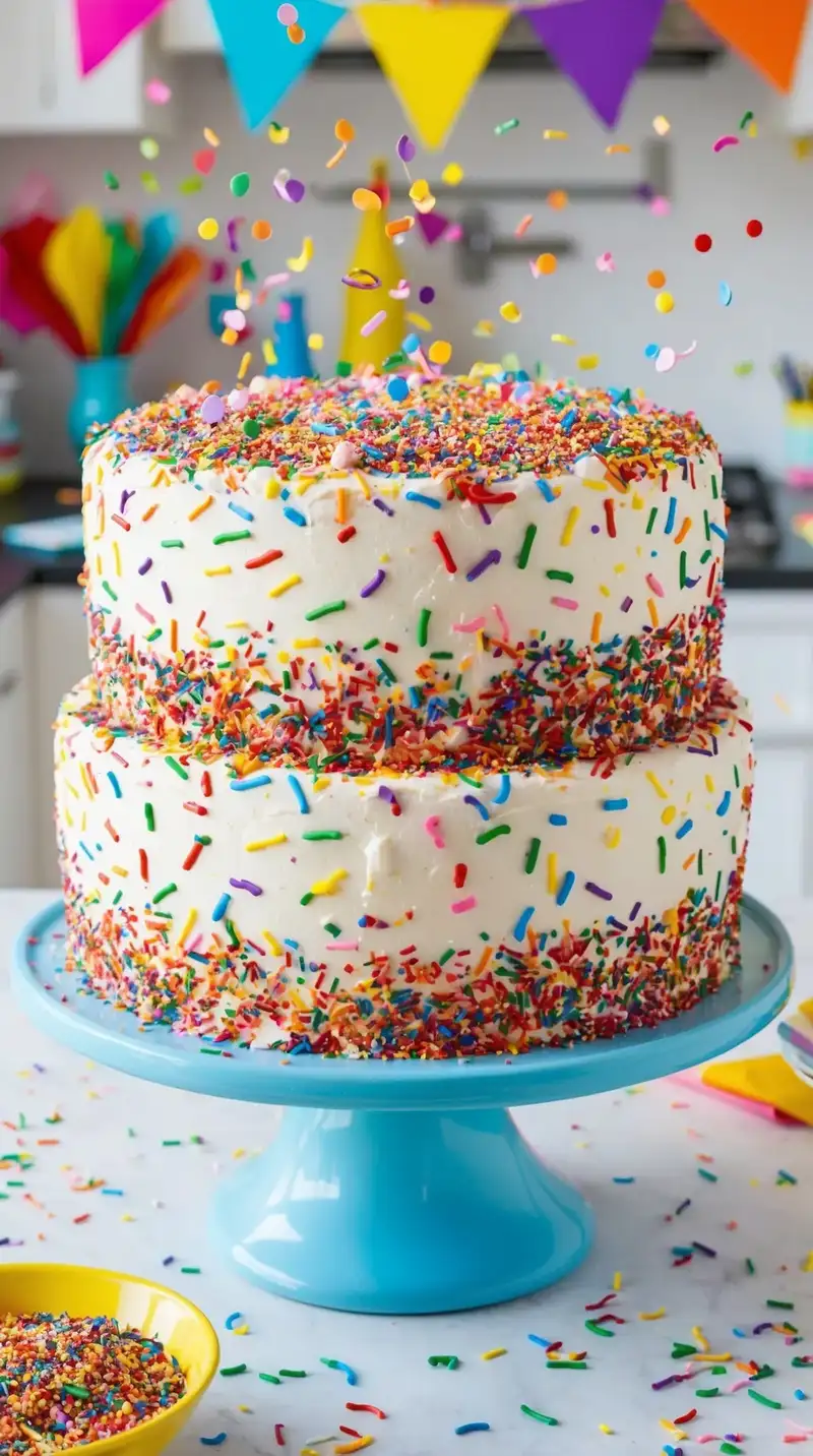 - Envision a cake bursting with colorful sprinkles, inviting everyone to join in.