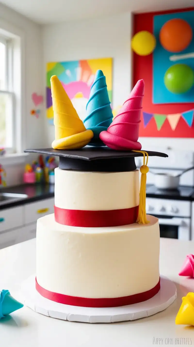 - Picture a cake that resembles a graduation hat topped with colorful cones.