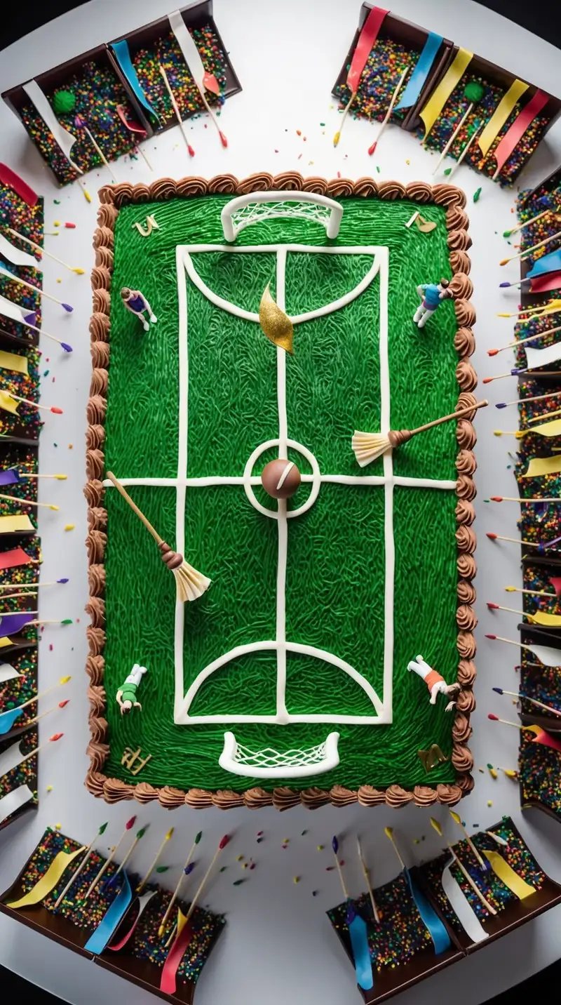 Think of a lively Quidditch match right on your cake. The chocolate base represents the grass, and the hoops stand tall at either end. You can hear the cheers as friends envision flying on broomsticks, racing for the Golden Snitch. “I can almost feel the wind in my hair!” someone says, sharing a smile with everyone else around the cake.