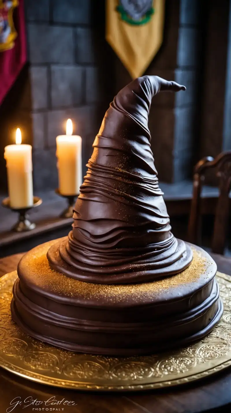 Imagine the Sorting Hat resting atop a dark chocolate cake, its edges perfectly shaped with a hint of magic. You can almost hear it murmuring, "Gryffindor, Hufflepuff, Ravenclaw, Slytherin.” The moment you wrap its ridges in creamy white fondant, it’s like you’ve brought the wizarding world to life. Golden shimmer dances around the hat, sparkling like the stars over Hogwarts. An impressed friend might whisper, “Is that cake or magic?”
