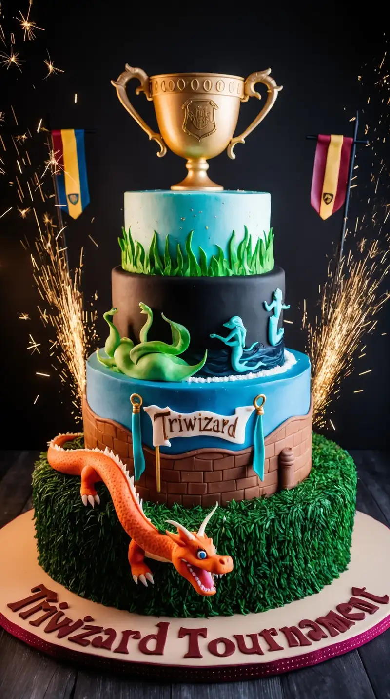 Closing your eyes, you can picture the fierce competition of the Triwizard Tournament, captured in a delicious cake. Each layer represents one of the schools, decorated with house colors and banners. Friends discuss their favorite champions, feeling the thrill of the competition. “Who do you think will win?” a friend questions, leaning in closer to the cake.