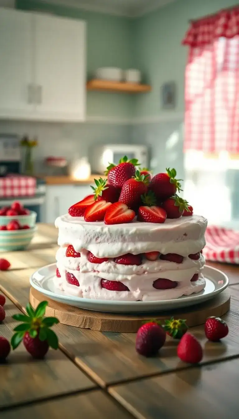 Imagine a field of strawberries bursting with flavor. This cake layers sweet strawberries and creamy ice cream together. Friends taste it and exclaim, "It’s like summer on a plate!" The joy of summer is inside every slice.