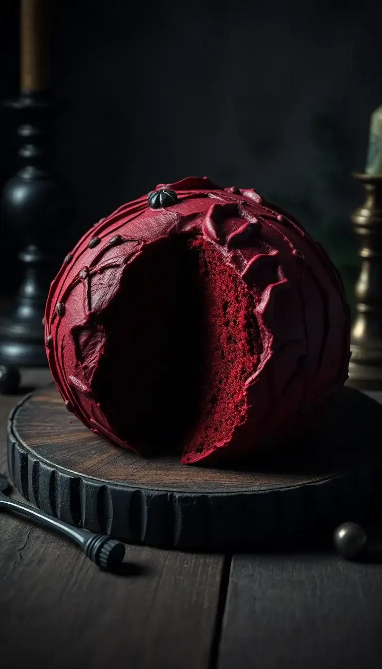 The Cursed Womb Red Velvet Cake looks like something from a spooky story! It is bright red and shaped like a big, round treasure. The icing is smooth and shiny, making it look magical. Tiny black decorations sit on top, adding a mysterious touch. This cake would be perfect for a Halloween party or a Jujutsu Kaisen-themed celebration. Friends would gather around, excited to taste this special treat. What a fun way to enjoy a slice of something that looks both delicious and a little eerie!