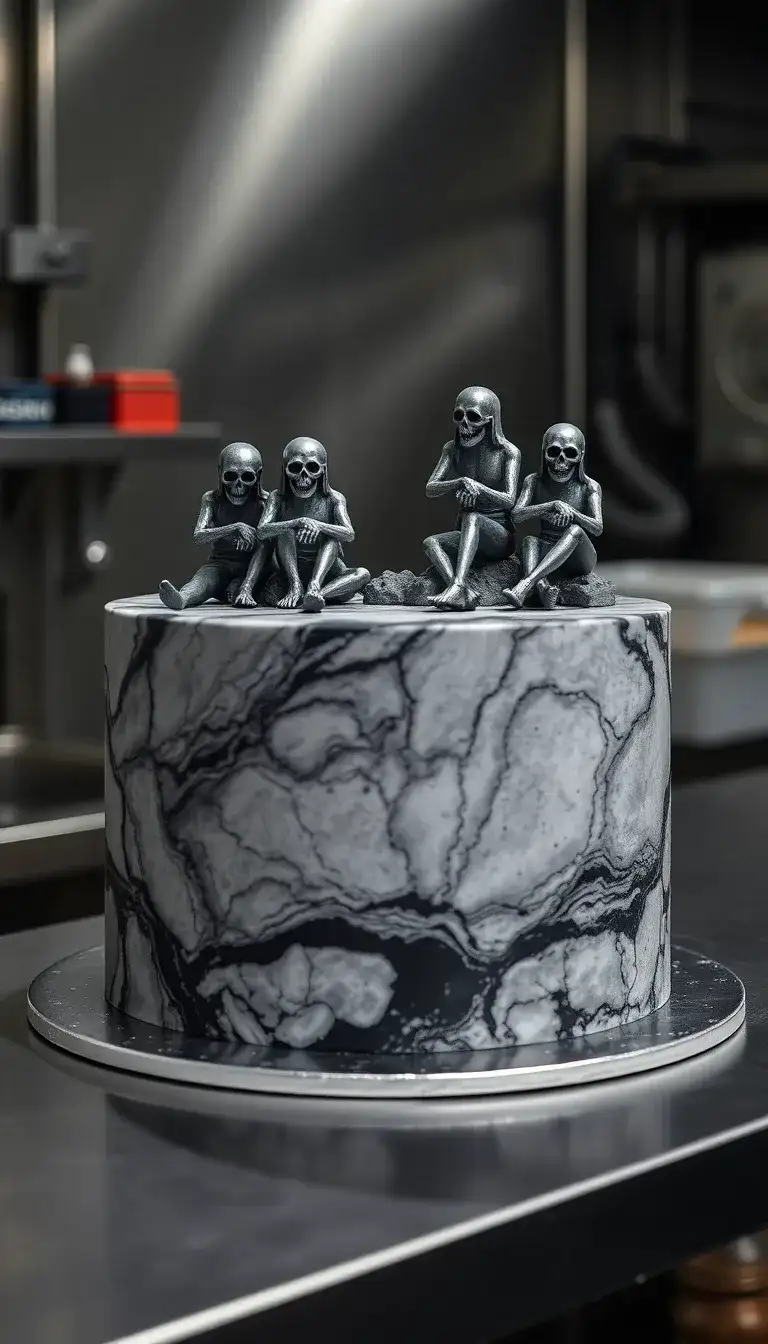 Principal Yaga’s Cursed Corpse Cake is a spooky treat that looks like it’s straight out of a Jujutsu Kaisen episode! The cake is dark and mysterious, covered in swirling black and gray patterns. Atop it sit four little skeletons, each with a funny pose. They seem to be having a great time, even though they’re not alive! This cake is perfect for anyone who loves adventure and a little bit of creepiness. It’s sure to be a hit at a Halloween party or a special celebration. Enjoy the fun and a sweet slice of this unique dessert!