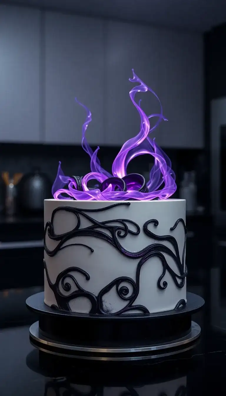 Yuta's Ring Collection Cake is a magical treat inspired by the anime Jujutsu Kaisen. The cake is white, smooth, and has dark, swirling designs that look like shadows. At the top, there are purple flames that seem to dance and glow, making it look super cool! This cake is perfect for fans who love the exciting world of jujutsu sorcerers. It would be a fun surprise for a birthday party or a special celebration. Everyone would be amazed by its magical appearance!