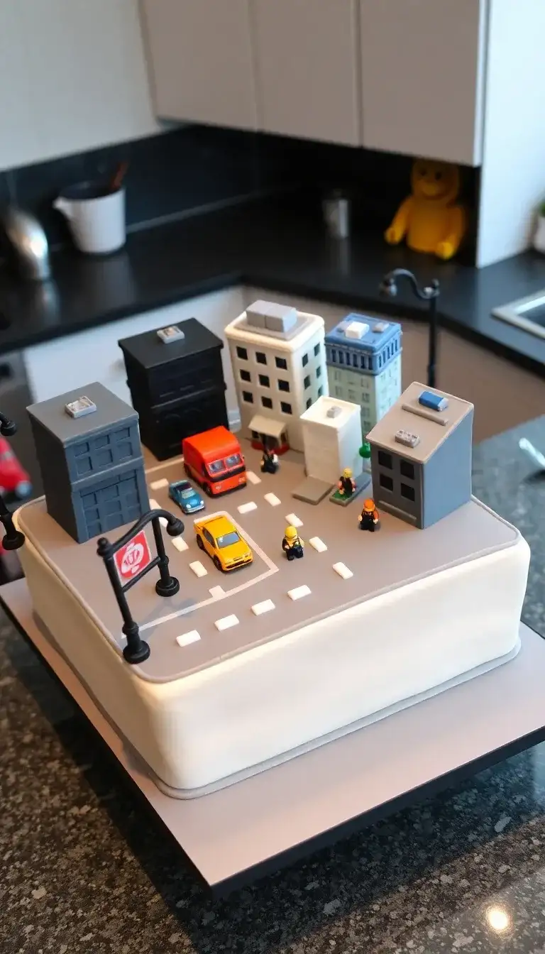 A Lego City Streets Cake is a fun and colorful dessert that looks like a busy city! The top of the cake has tiny buildings made from Lego pieces. There are cars zooming by on the roads, and little Lego people are walking around. Street lamps light up the scene, making it feel alive. This cake is perfect for a birthday party or any special event. Everyone loves Lego, and this cake brings that playful spirit to life in a tasty way!