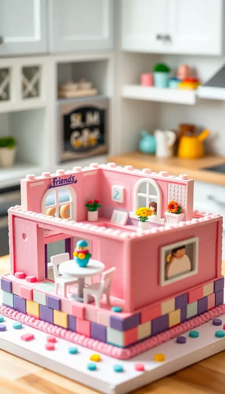 The Lego Friends Cafe Cake is a colorful and fun creation! It looks like a cute cafe made out of Lego bricks. The cake is pink and has little windows and doors. There are tiny chairs and tables where friends can sit and enjoy treats. Flowers decorate the cafe, making it even more cheerful. This cake is not just for eating; it’s like a little playset too! It brings smiles and joy to everyone who sees it. Perfect for a birthday or party, it’s a sweet and playful masterpiece!