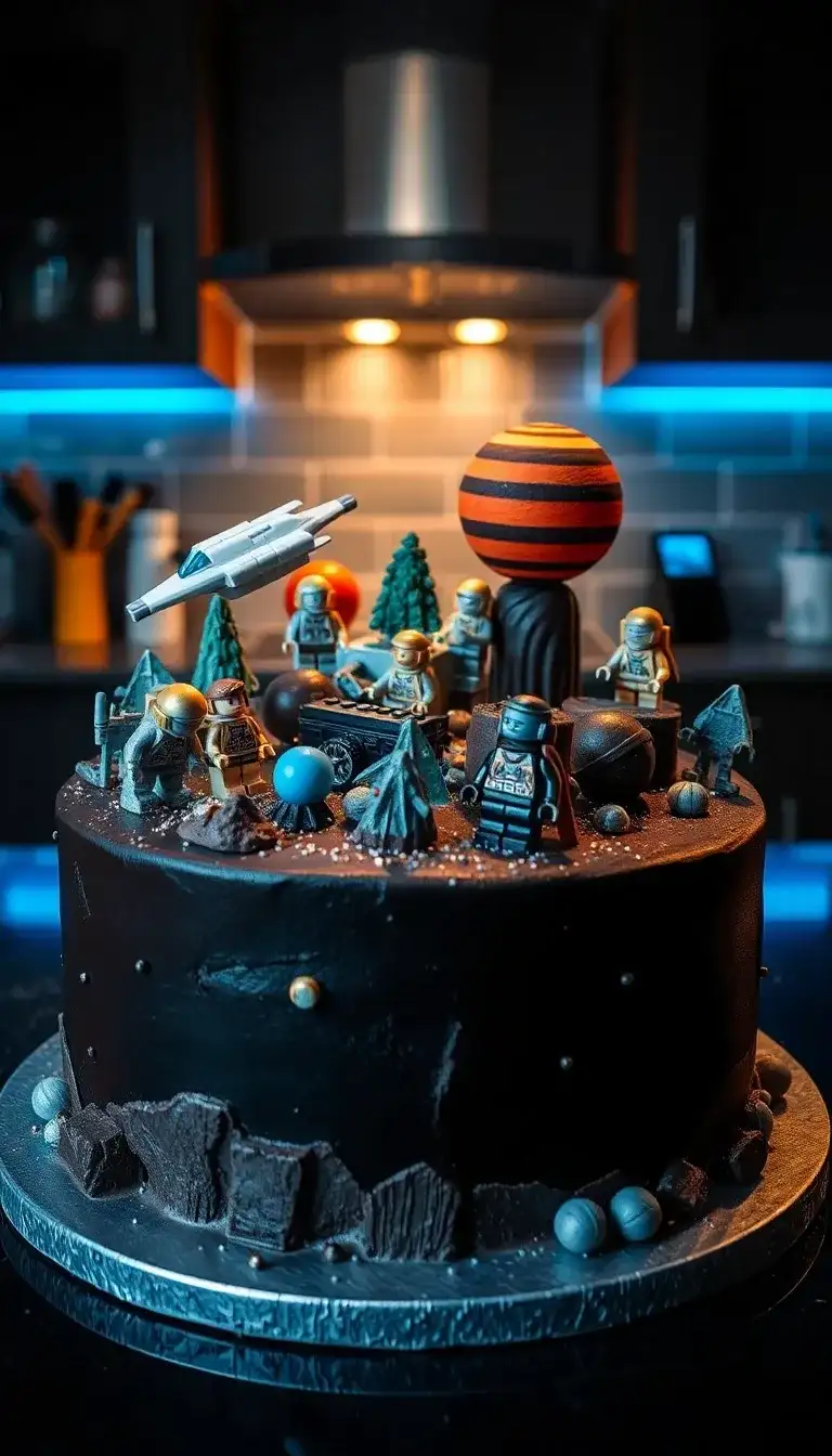 The Lego Space Adventure Cake is an exciting treat! It looks like a fun planet from outer space. There are colorful Lego astronauts ready for a mission. Some are exploring rocky terrain while others are near shiny planets. A cool spaceship zooms above them. Tiny trees add a touch of green to the dark cake. It’s like a mini space world made of sweets! Everyone would love to dive into this tasty adventure.