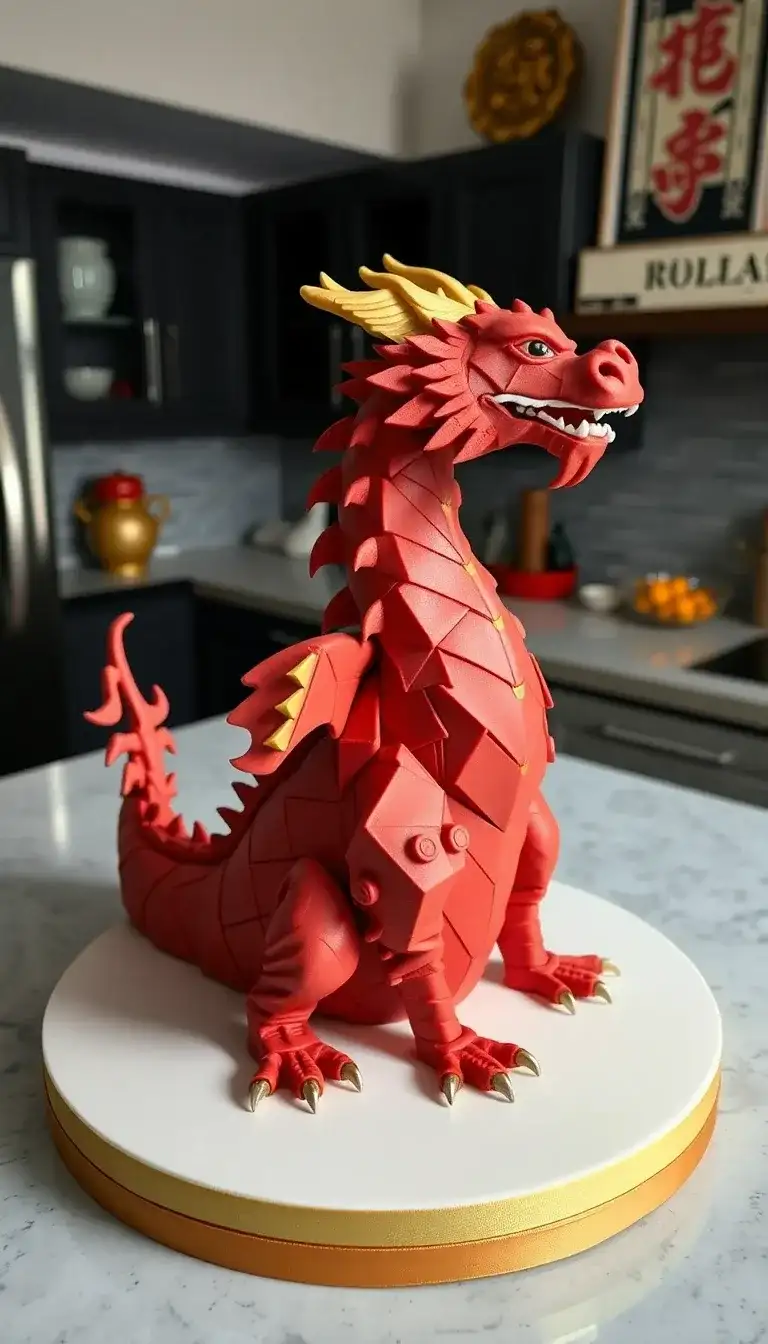 Have you ever seen a cake that looks like a dragon? This amazing cake is shaped like a fierce, red dragon! It has shiny scales and big, pointy claws. The dragon's head has a fierce look, with sharp teeth and bright eyes. Its wings are raised high, ready for flight. This cake would be perfect for a birthday party or a special celebration. Everyone would be excited to see it and maybe even take a picture before eating it. A cake like this brings imagination and fun to any event!