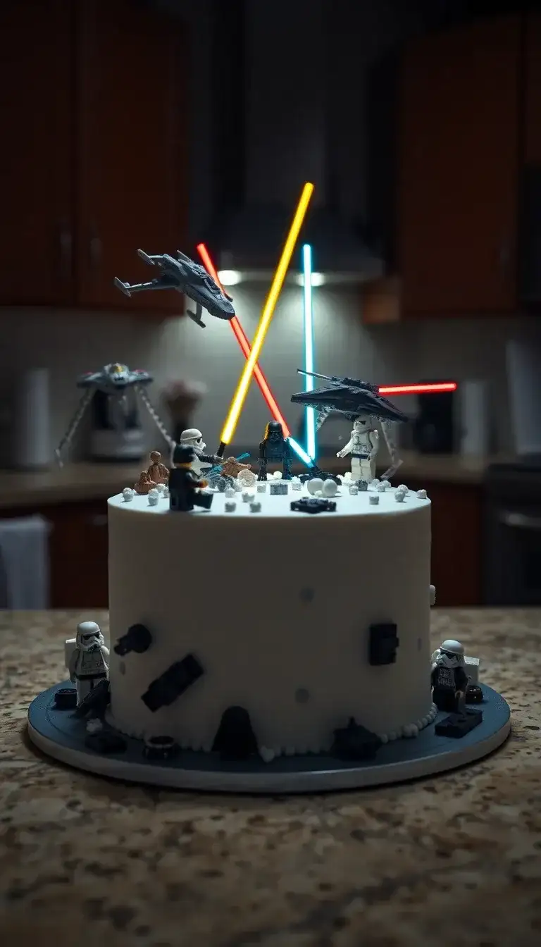 The Lego Star Wars Battle Cake is a super cool treat! It looks like a fun battlefield from a galaxy far, far away. Tiny Lego figures are ready for action on top of the cake. There are Stormtroopers, spaceships, and even lightsabers shining bright. The cake is decorated to look just like a scene from the movies. It’s perfect for a birthday party or any special day. Everyone would love to see this amazing cake!