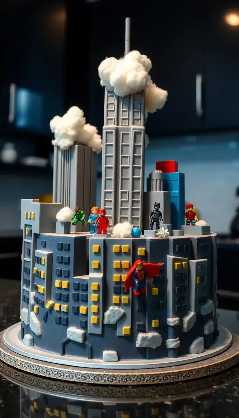 A Lego Superhero Skyline Cake is a fun and colorful treat that looks like a city made of Lego blocks! Tall buildings rise up from a round cake, and fluffy white clouds sit on top. Superheroes stand on the rooftops, ready for action. There’s a green hero, a speedy one in red, and even a hero in a cape! The cake is decorated with bright windows and little details that make it feel like a real city. It’s a perfect dessert for a superhero party, bringing excitement and creativity to any celebration!