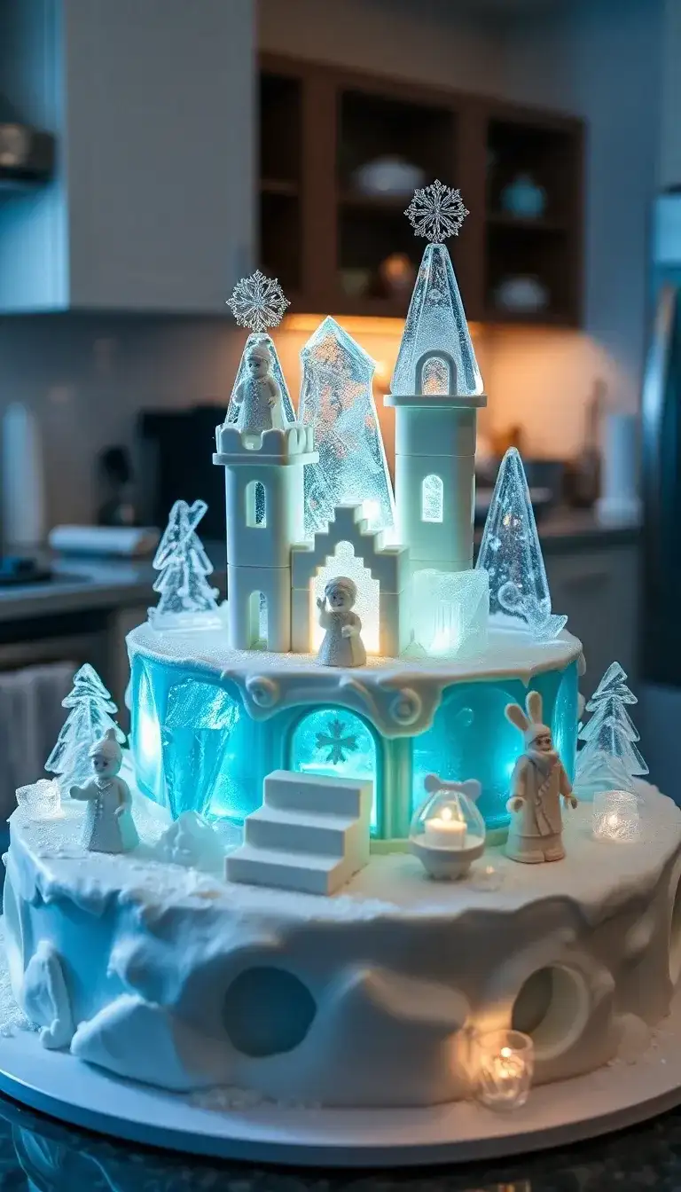 The Lego Ice Kingdom Cake is a magical treat that looks like it came from a winter wonderland! It has tall, sparkly towers made of icing that shine like ice in the light. Little Lego figures stand proudly on top, ready for an adventure in their snowy kingdom. Tiny trees surround the cake, adding to the chilly scene. The blue colors give it a frosty feel, making it perfect for a fun celebration. Everyone would love to take a bite of this amazing cake!
