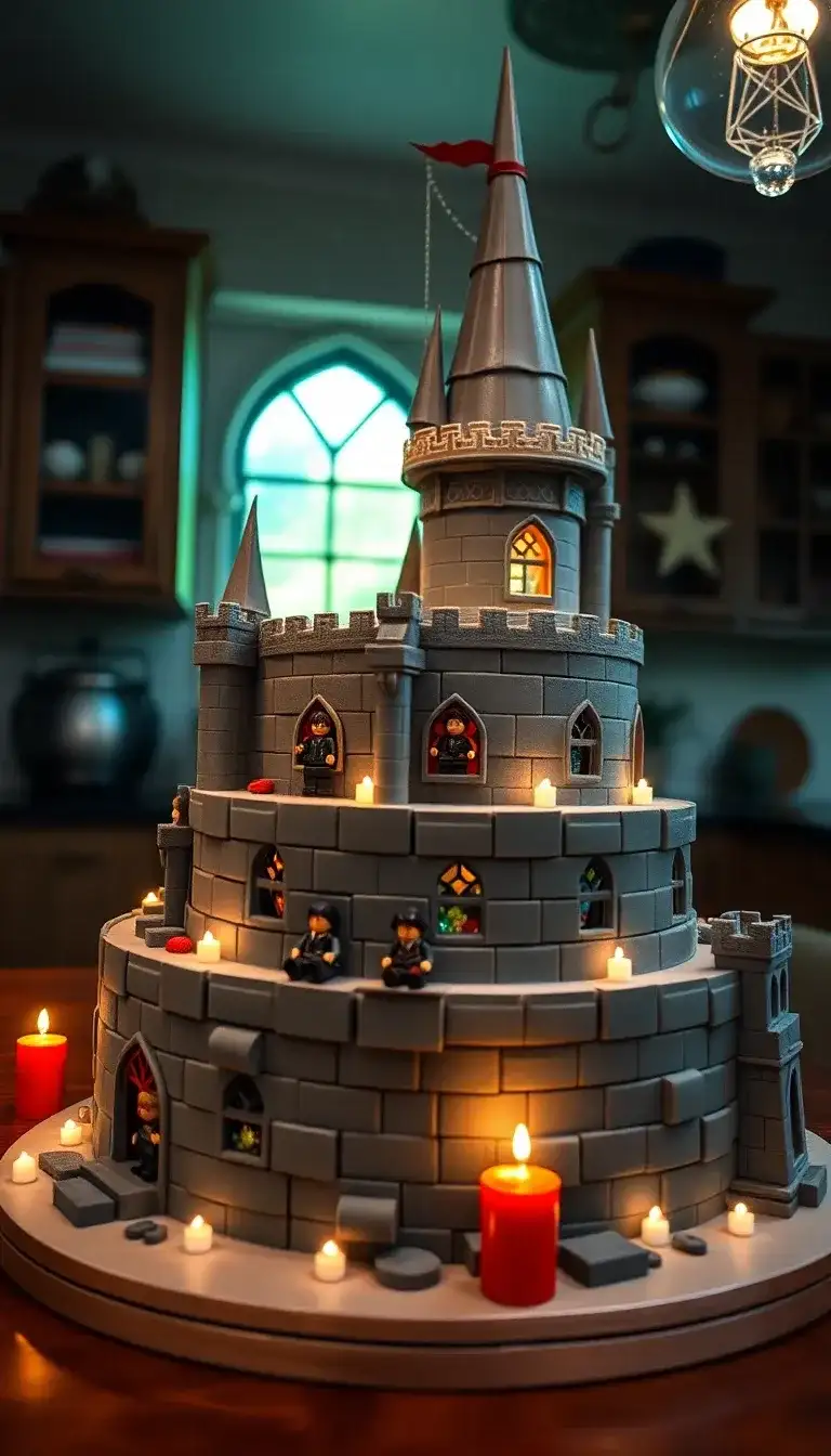 The Lego Harry Potter Castle Cake is a magical treat! It looks just like a real castle made of Lego bricks. With tall towers and little windows, it shines brightly with tiny lights. Mini Lego figures stand in the windows, making it feel like they are part of the fun. The cake has red candles that glow, adding to the castle's charm. This delicious cake would be perfect for any celebration, especially for fans of Harry Potter and Lego. Everyone would love to see this amazing, tasty creation!