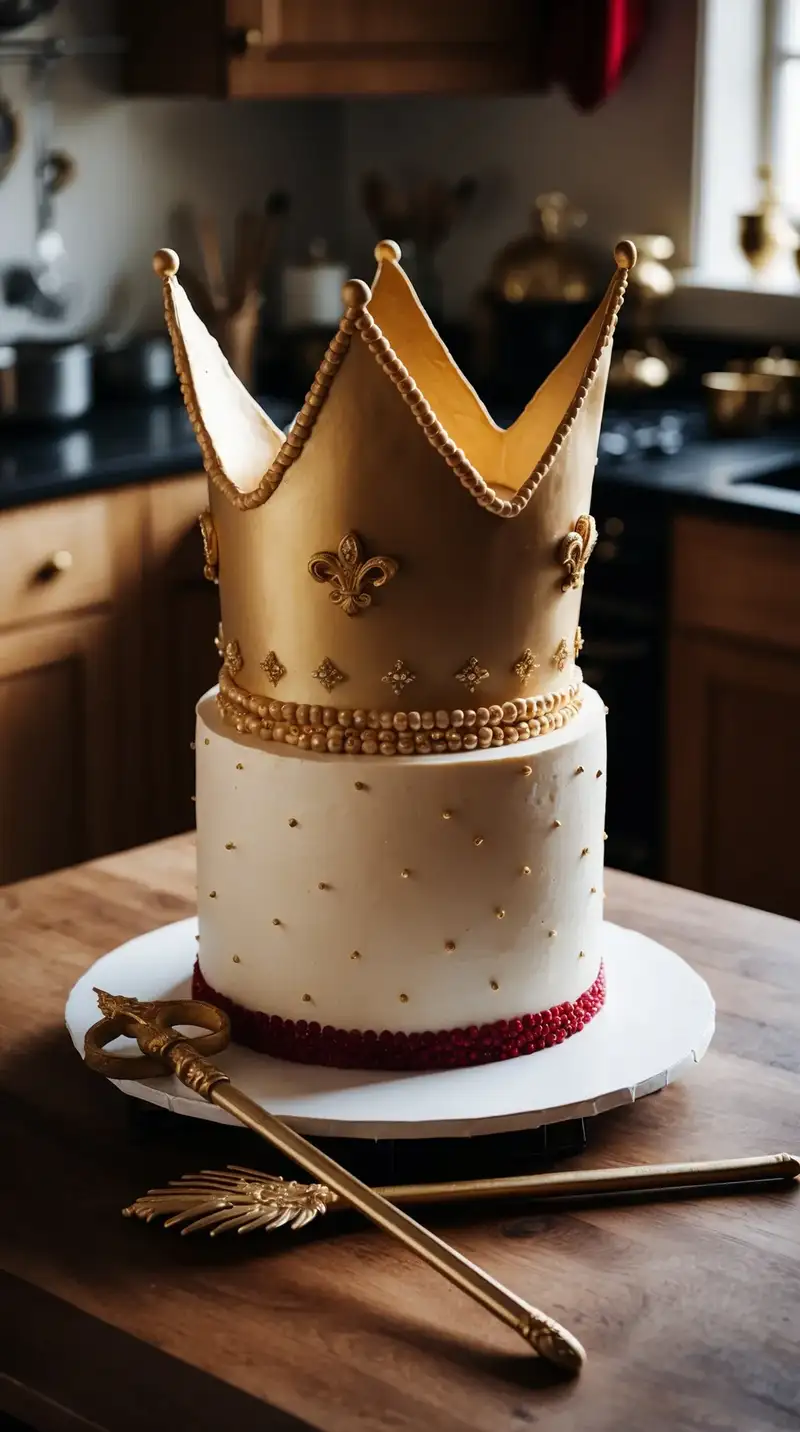 The Crown and Scepter Cake stands tall, full of royalty and grandeur! Shaped like a majestic crown, it brings whispers of adventures in castles and enchanted lands.
