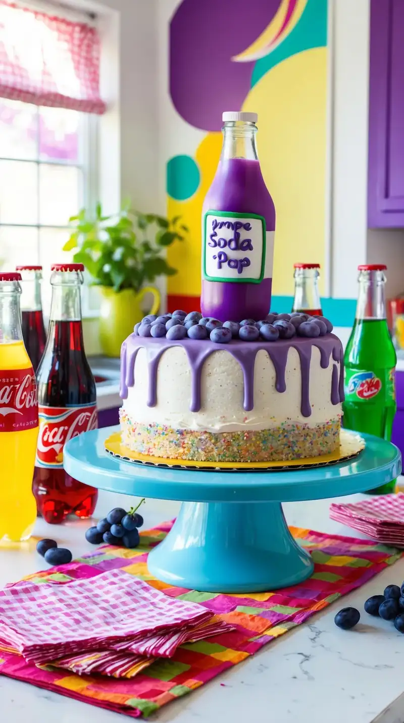 Curiosity bubbles up as you see this playful creation. A cake that tastes like grape soda? It sounds wild, yet the sweetness beams from every layer. Picture frosting so fluffy, it feels like clouds on your tongue. A fondant soda bottle tops it off, playful and fun.