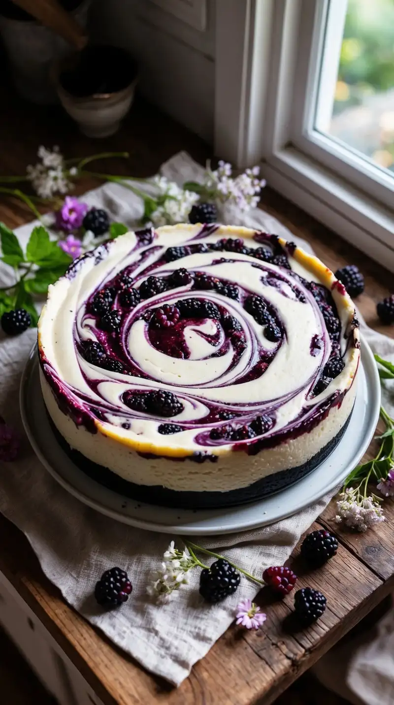 Envision a cheesecake that wraps fresh mulberries in creaminess. The swirls create patterns as beautiful as a painting, calling you to dig in. Slowly, you take a slice, and the flavors envelop you like a warm blanket.