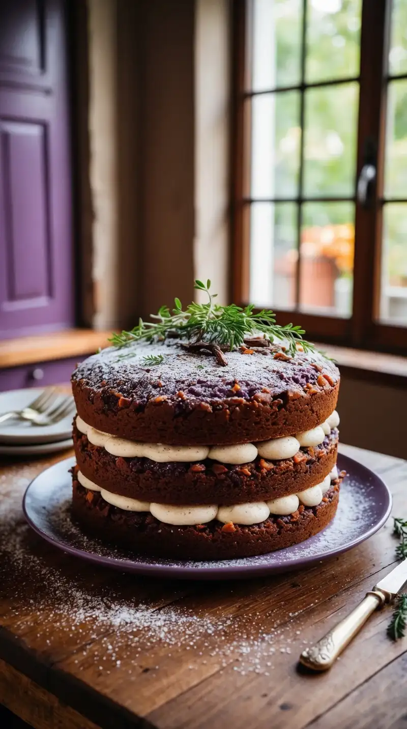 Think of a cake that surprises you at every turn. The velvety smoothness of dark chocolate pairs with the unexpected flavor of eggplant. It sounds odd, but the taste enchants the tongue. The top glistens with a lavender frosting, and golden touches add elegance.