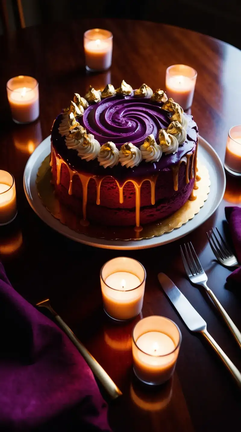 Think of a cake that resembles the sky during twilight, rich and royal. Deep purples fade into soft lavender, each layer telling a story. The combination of flavors—moist chocolate, floral vanilla, and zesty lemon—creates a tasting journey.