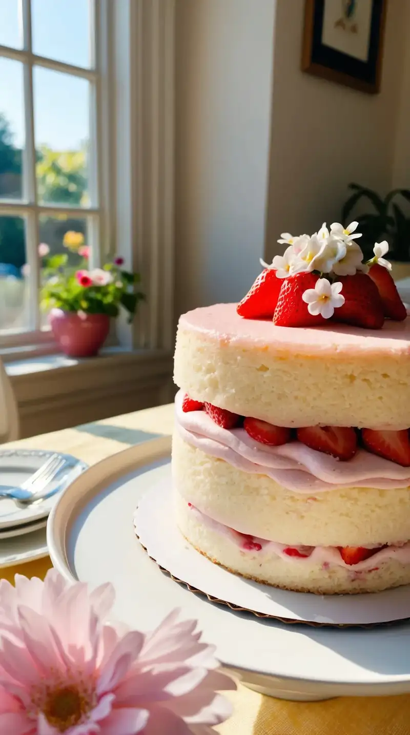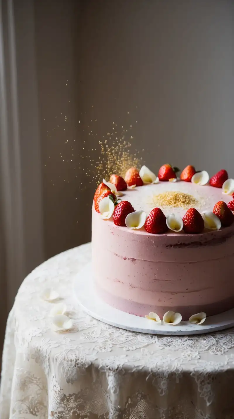 The sweet strawberry buttercream dances on top, adding a sweet finish. Fresh strawberries rest on the cake as if they’re about to tell a secret. "It’s so pretty!" they say, eyes shining with delight.