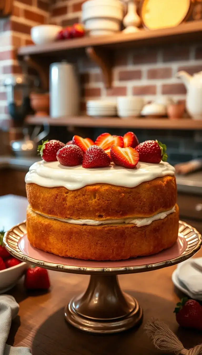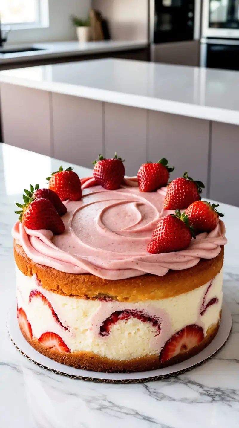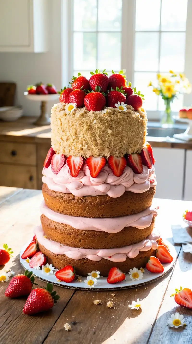 Imagine walking into a bright kitchen filled with the sweet smell of strawberries. You see a towering cake that looks like a strawberry shortcake but with a twist. Three fluffy layers sit proudly on the table. The base is a moist strawberry cake, bursting with flavor. It’s layered with creamy strawberry buttercream that catches the light just right.