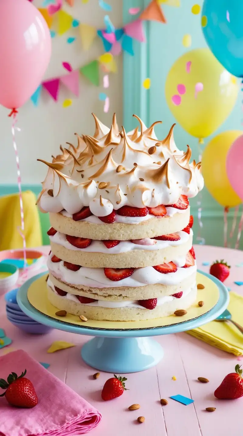 A playful cake, light and airy, known as Strawberry Meringue Fantasy, invites wonder. Each slice reveals fluffy cake with clouds of meringue pressed on top.