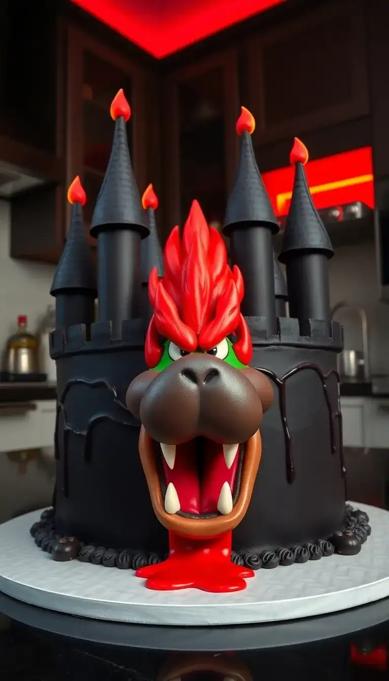 Bowser's Castle is a super cool cake that looks just like the one from the Mario games! It has tall, black towers with fiery tips, making it look really spooky. The front of the cake features Bowser's big, fierce face, with his sharp teeth and bright red hair. There’s even a fun, red gooey detail that makes it look like he’s roaring. This cake is perfect for a Mario party and would make anyone feel like they are in a video game adventure! Everyone would want a slice of this awesome creation!