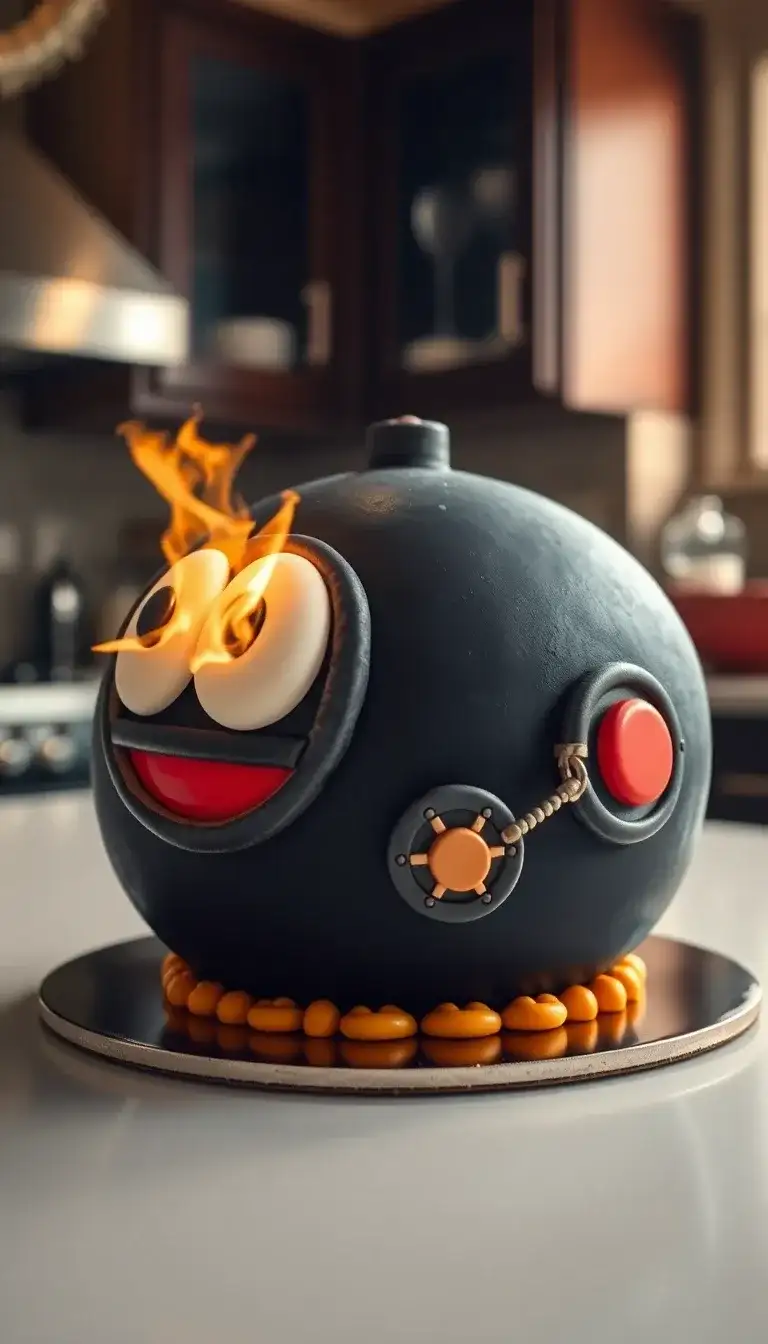 In the Mario games, Bob-ombs are funny little creatures that look like round bombs with big eyes and a smiling face. They are known for their playful explosions! Imagine a cake that looks just like a Bob-omb, complete with a shiny black body and a bright red button. This cake might even have flames on top, making it look like it’s ready to explode with fun! The orange decorations around the bottom could remind you of the cool colors in the Mario world. This cake would be perfect for a birthday party, bringing a splash of excitement and a taste of adventure to the celebration!