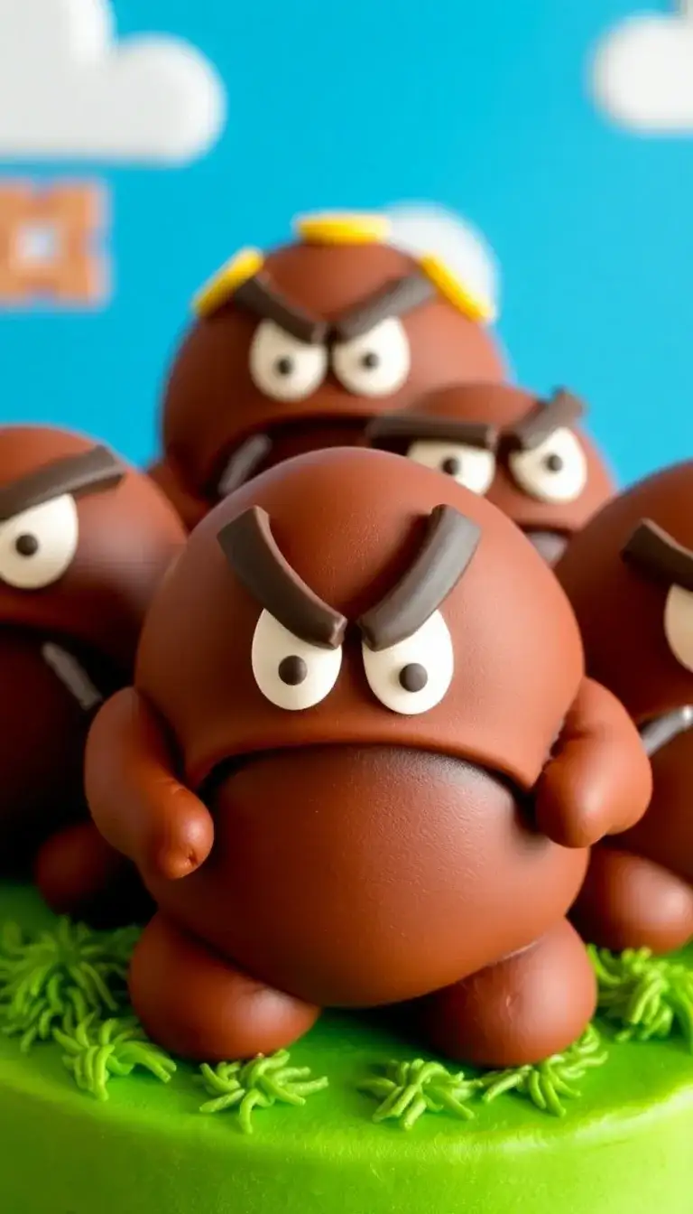 The Goomba Gang is ready for an adventure! These funny, brown creatures are from the Mario games. They have big eyes and frowny faces, showing they mean business. Each Goomba stands on a bright green cake, looking tough and ready to take on Mario. They might be small, but they love to team up and cause a little trouble. Kids who love video games will enjoy seeing these cute characters come to life in a sweet way! What a fun treat for any Mario fan!