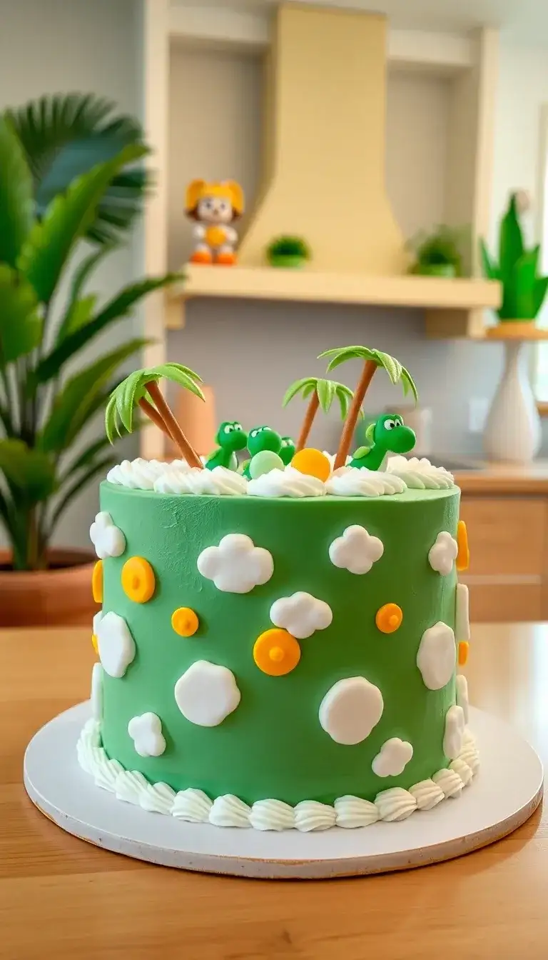 Yoshi's Island is a fun and colorful place, just like this amazing cake! The cake is bright green, just like Yoshi, and has cute little Yoshi figures on top. There are tiny palm trees that look like they belong on a sunny beach. White clouds and sunny yellow dots add a cheerful touch. This cake reminds everyone of adventures in a magical world where Yoshi and Mario jump and play. It’s perfect for a party where everyone can enjoy the fun of Yoshi's Island!