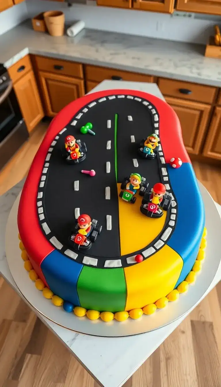 Check out this awesome Mario-themed cake! It looks just like a race track from the Mario Kart games. Bright colors surround the cake, making it super fun to look at. Little racers zoom around the track in their go-karts. Each character has a special spot on the cake, ready to race. There are even fun details like mushrooms and green shells! This cake is perfect for a birthday or any Mario Kart party. It will make everyone want to join in on the racing fun!
