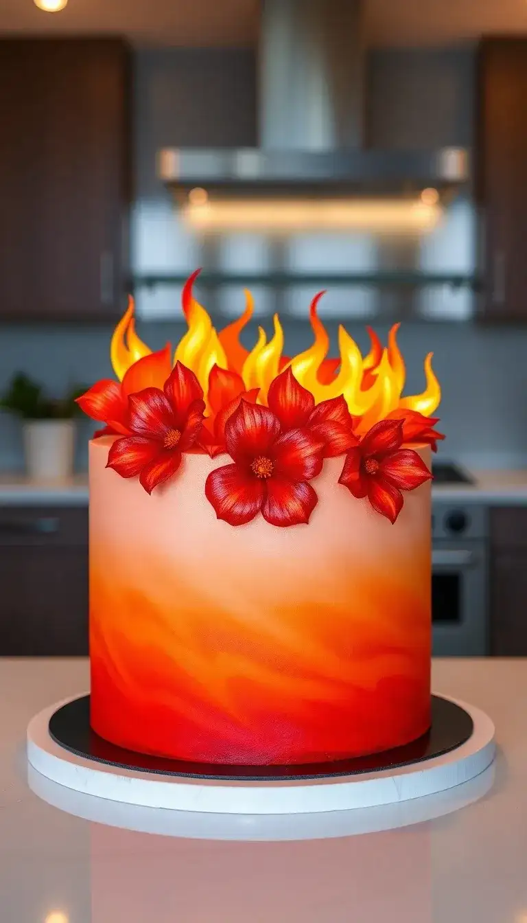 Get ready for a super fun celebration with a Mario-themed cake that looks like it’s on fire! This cake is bright and colorful, just like the Fire Flower from the game. The top is decorated with beautiful red flowers and flames, making it look exciting and magical. Everyone will want to take a slice, and it will bring smiles to all the party guests. This cake is perfect for a birthday or any special event, turning it into a real-life adventure from the Mario world!
