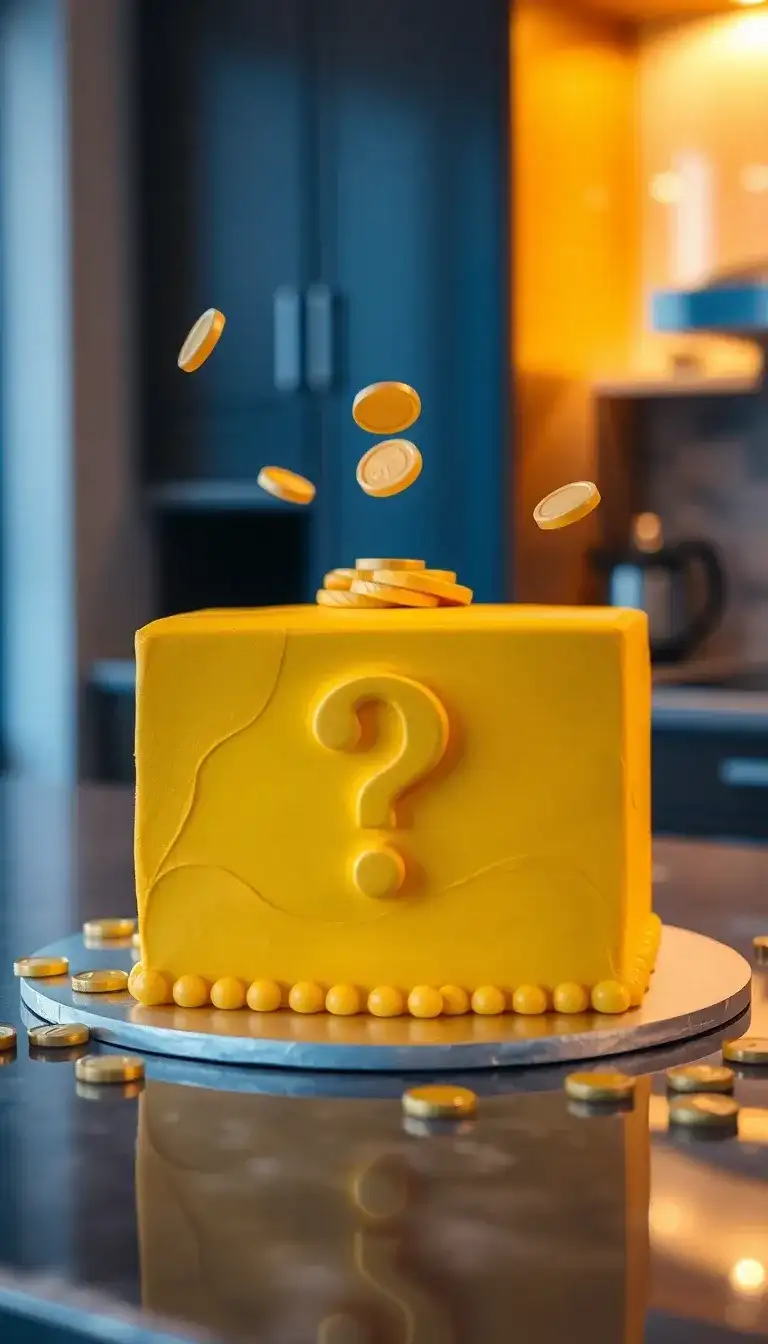 The "Question Block Surprise" cake is a fun treat that looks just like the famous blocks from Mario games! It’s bright yellow and has a big question mark on the front. Floating coins seem to pop out, making it look exciting and magical. This cake is perfect for birthday parties or special celebrations. Everyone will want to take a slice and see what surprise is inside. It’s like a party in a cake!