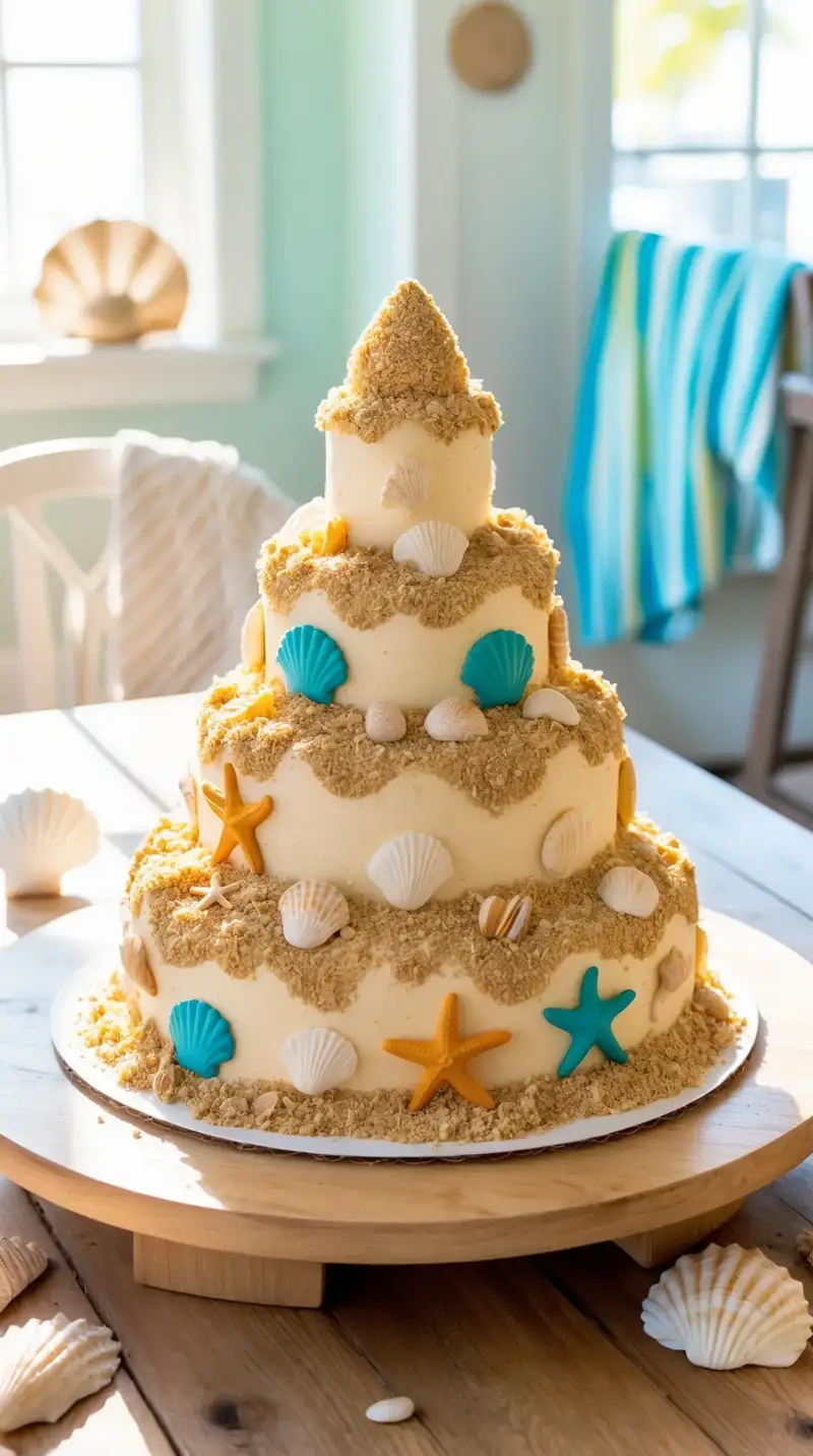 You stumble upon a cake that looks like a playful sandcastle on the beach. “This is adorable!” a sibling squeals. The sandy texture invites you to reach out and feel.